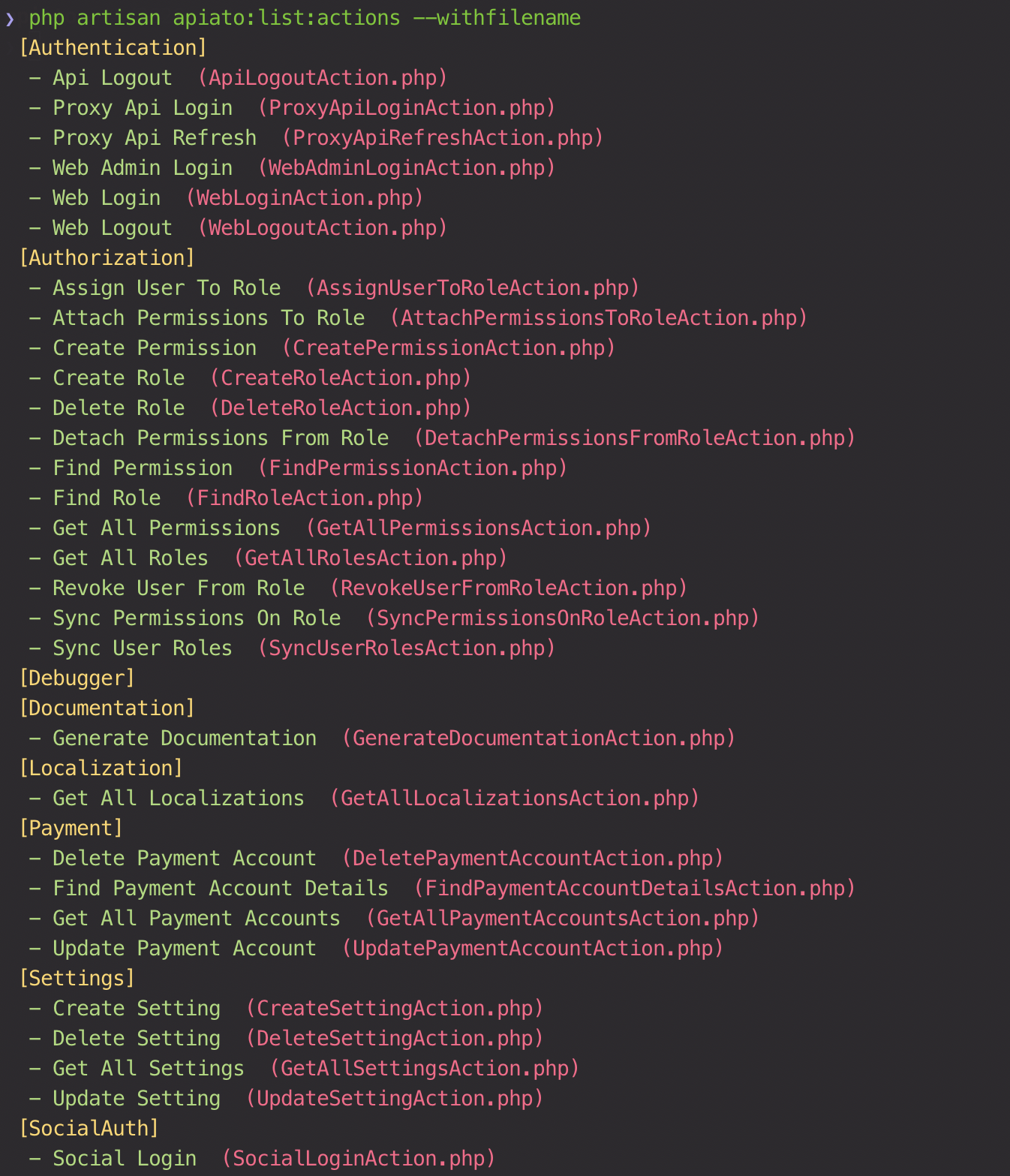 apiato:list:actions --withfilename
